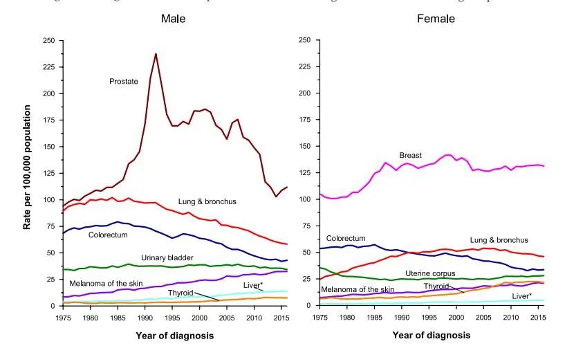 肺及支气管癌的发病率从1975到2005年逐渐上升之后逐渐呈现缓慢下降趋势,结直肠癌发病率呈下降趋势,子宫癌发病率基本稳定,而肝癌、甲状腺癌和皮肤黑色素瘤的发病率呈现上升趋势。