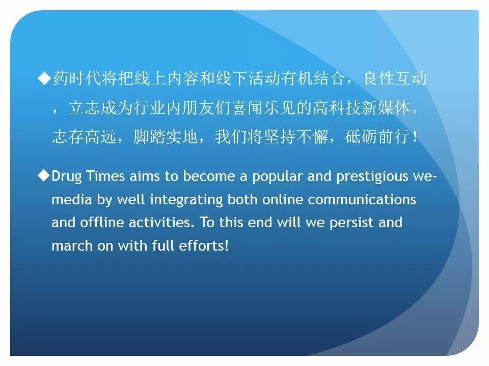 药时代将把线上内容和线下活动有机结合,良性互动,立志成为行业内朋友们喜闻乐见的高科技新媒体。志存高远,脚踏实地,我们将坚持不懈,砥砺前行!