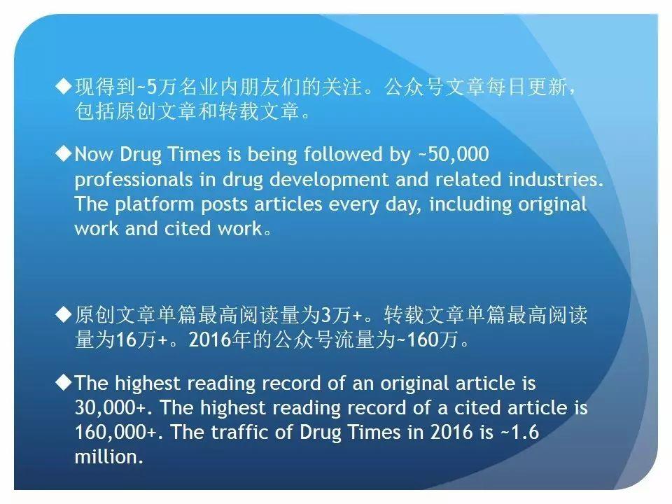 平台的读者——主要来自中外药企、生物技术公司、医药研发生产服务公司、投资公司、监管机构、咨询公司、高新园区、媒体,等等。