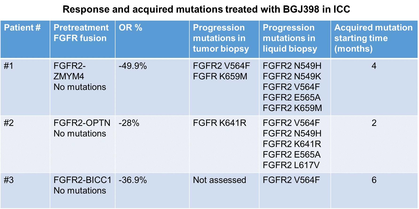 Polyclonal secondary FGFR2 mutations drive acquired resistance to FGFR inhibition in patients with FGFR2 fusion-positive cholangiocarcinoma. Goyal L, et al. Cancer Discov 2017;7:252–63.