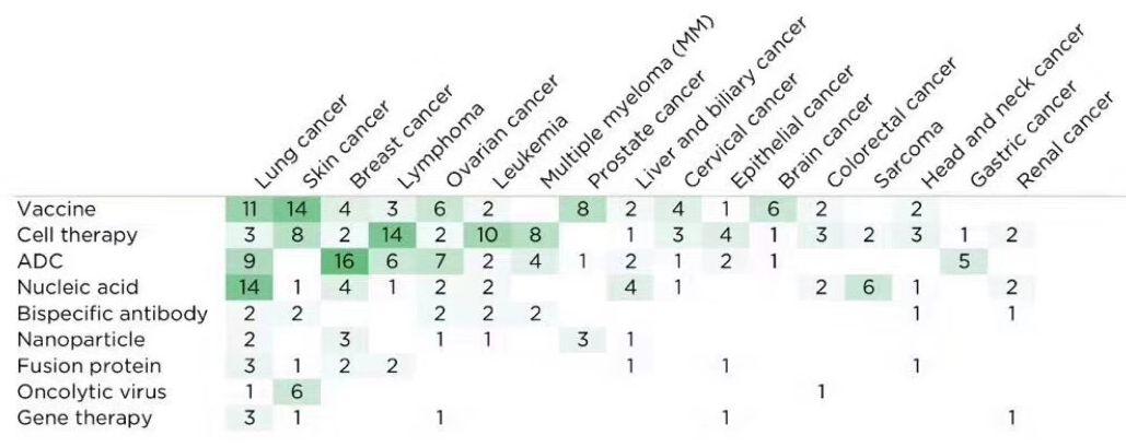 疫苗>细胞疗法>ADC(抗体偶联药物)>核酸>双特异抗体>纳米颗粒>融合蛋白>溶瘤病毒>基因疗法。