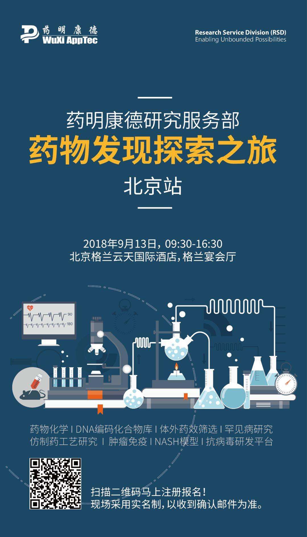 主题 药明康德研究服务部药物发现探索之旅 时间 2018年9月13日,09:30 – 16:30 地点 北京格兰云天国际酒店 格兰宴会厅 会议日程 09:30-09:45 药明康德集团介绍 陈晓蕾,药明康德商业运营和战略管理部主任 09:45-10:10 药明康德DNA编码化合物库(DEL)生态体系 彭宣嘉 博士,药明康德研究服务部DEL负责人,执行主任 10:10-10:35 新技术能力助力化学合成 孙亮 博士,药明康德研究服务部化学服务部主任 10:35-10:50 上午茶歇 10:50-11:15 灵活高效的合作 — 赋能创新药研发 吴益明,药明康德研究服务部药物研发国际服务部主任 11:15-11:40 助力小分子仿制药和新药申报工艺与质量研究的服务平台 尚慕宏 博士,药明康德研究服务部化学服务部高级主任 黄春城 博士,药明康德研究服务部核心分析部主任 11:40-12:05 助力仿制药一致性评价—杂质分离、鉴定和合成平台 董华,药明康德研究服务部化学服务部高级主任 马春辉,药明康德研究服务部核心分析部主任 12:00-13:15 午餐 13:15-13:40 免疫转化医学平台助力肿瘤免疫新药研发 冀群升 博士,研究服务部肿瘤和免疫部负责人,药明康德副总裁 13:40-14:05 体外药效筛选平台 李之浩 博士,药明康德研究服务部生物部高级主任 14:05-14:30 肝纤维化及非酒精性脂肪性肝炎的药物研发模型平台 李福刚,辉源生物体内药理学高级资深总监 14:30-14:55 体内药理学模型平台在新药研发中的应用 党怀欣 博士,药明康德研究服务部生物部副主任 14:55-15:15 下午茶歇 15:15-15:40 转基因动物在自身免疫性疾病和罕见病研究中的应用和进展 林卿 博士,药明康德研究服务部肿瘤和免疫部主任 15:40-16:05 抗病毒药物研发一体化服务平台 (VIROLWUXI) 周琼 博士,药明康德研究服务部生物部主任 16:05-16:30 早期毒性优化筛选在新药研发中的应用 杨传秀 博士,药明康德研究服务部生物部主任 16:30-16:45 讨论 会议结束 注册方式 本次会议免费开放,主要面向生物科技、制药企业负责人和研发人员,大学和研究机构负责人,相关领域科研专家等。 请长按二维码或点击文末“阅读原文”马上注册报名。会议当天采用实名制,以收到确认邮件为准。