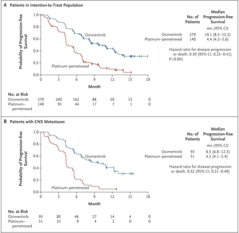 Osimertinib组与标准化疗组相比,中位无进展生存期(PFS) 显著高于后者(10.1 个月Vs. 4.4 个月),并将EGFR T790M突变的NSCLC患者的疾病进展或死亡风险降低70%;