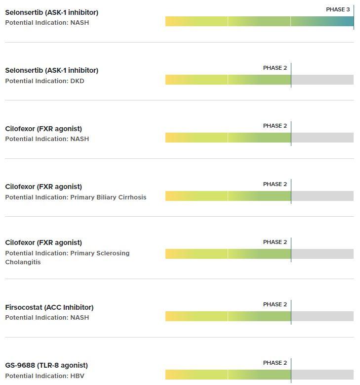 如果selonsertib被证明是一个彻底的失败,它将加入越来越长的阵亡名单,名单上的这些药物都曾被寄予成为吉利德开启新收入流康庄大道的厚望,但最终纷纷倒在了险象环生的临床试验的征途上。吉利德在2016年取消了另一个NASH热门候选药物simtuzumab的开发,该药物是吉利德于2010年花费2.25亿美金收购Arresto Biosciences而获得的,之后eleclazine、momelotinib和其它瞄准心血管疾病和癌症的药物先后被“灭灯”。