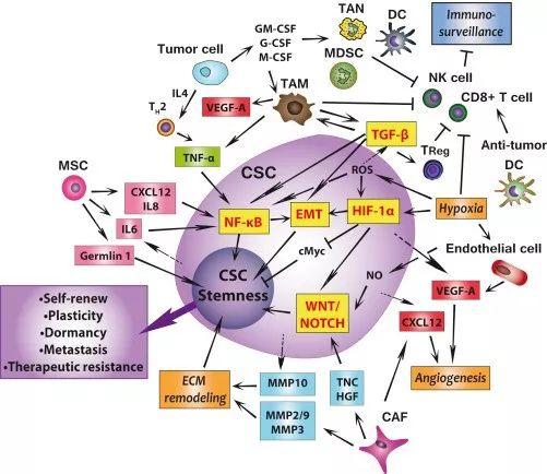 虽说科学对肿瘤的研究已跨入新纪元,但肿瘤细胞似乎始终有更多的秘密和暗招,使人类永远无法比它高过一头。但是,人类始终没有气馁,也绝不会放弃对“肿瘤密码”破解的努力。近期,一些科学家对肿瘤细胞新的研究发现发表在《Nature》杂志上,研究结果揭示了,这群欲转移成功发展自己的肿瘤细胞,是如何获得自己生存所需要的Niche。这一研究将使我们更好地理解肿瘤细胞强权使自己生存、强大并对治疗产生抵抗的行为方式。首先,我们来解释一下Niche。嗯,这个单词,词典上翻译为“龛”。但“肿瘤细胞龛”我想大家应该是不明白的,至少笔者是看不懂的。深入研究,哦,原来如此。Niche,笔者赞同把它译为“老巢”——肿瘤细胞的“老巢”,用当下时髦的话,也可叫做“舒适区”。其实,Niche意指一种微生物环境,一个肿瘤细胞所赖以生长的特殊的微环境,也可简单理解为肿瘤细胞的生长环境。这种微环境可以控制细胞的数量、细胞分化还是不分化等各种各样的细节。这个微环境包括了免疫系统、成纤维系统、内皮细胞,还有细胞因子、生长因子等各种信号分子[1][2]。应该不难理解,Niche对肿瘤的生长起着重要作用。因此,肿瘤细胞为了存活和强大会不择手段为自己建立这个“舒适区”。下图是一个比较基本的肿瘤干细胞Niche。看上去好像超级错综复杂,实际上也是!好了,我们看看就好,点到为止,钻进去怕会出不来!