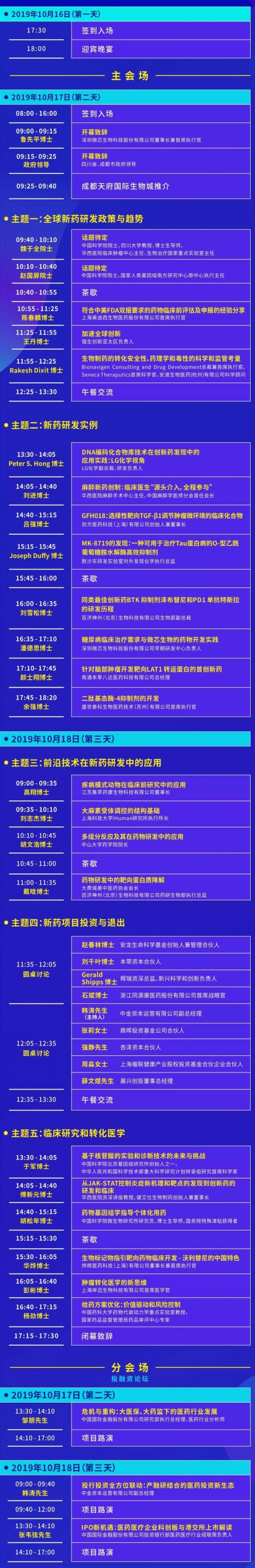 全球新药研发政策与趋势、新药研发实例、前沿技术在新药研发中的应用、新药项目投资与退出、临床研究和转化医学五大主题。