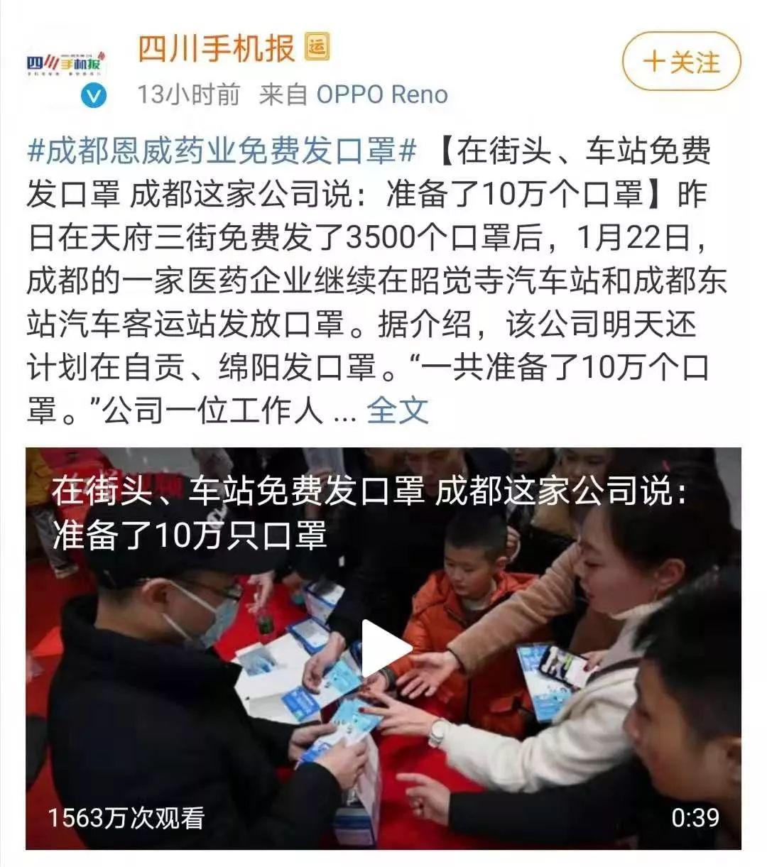1月21日起,恩威药业在成都天府三街、汽车站、成都东站等地发放免费口罩,据员工表示,公司共准备10万个免费口罩,还计划前往自贡、绵阳发放。