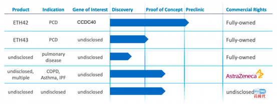 Ethris成立于2009年,是一家专注于呼吸 系统疾病的mRNA治疗开发企业。Ethris利用其首创的SNIM®RNA技术平台,直接将mRNA导入病灶部位。目前,Ethris所有管线产品均处于临床前阶段,其中ETH42进展最快,用于治疗原发性纤毛不动综合征(Primary Ciliary Dyskinesia,PCD)。