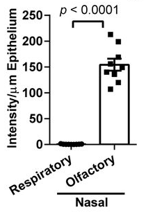 接下来研究人员量化了鼻窦炎患者的呼吸和嗅觉上皮细胞中ACE2的荧光强度(图3),并观察到其在嗅觉上皮细胞中极高的荧光强度,为呼吸上皮细胞的200-700倍。 这显示了ACE2与嗅觉上皮细胞显示了很强的相关性,所以研究人员认为这些细胞的感染可能是某些新冠肺炎患者出现嗅觉丧失的原因。