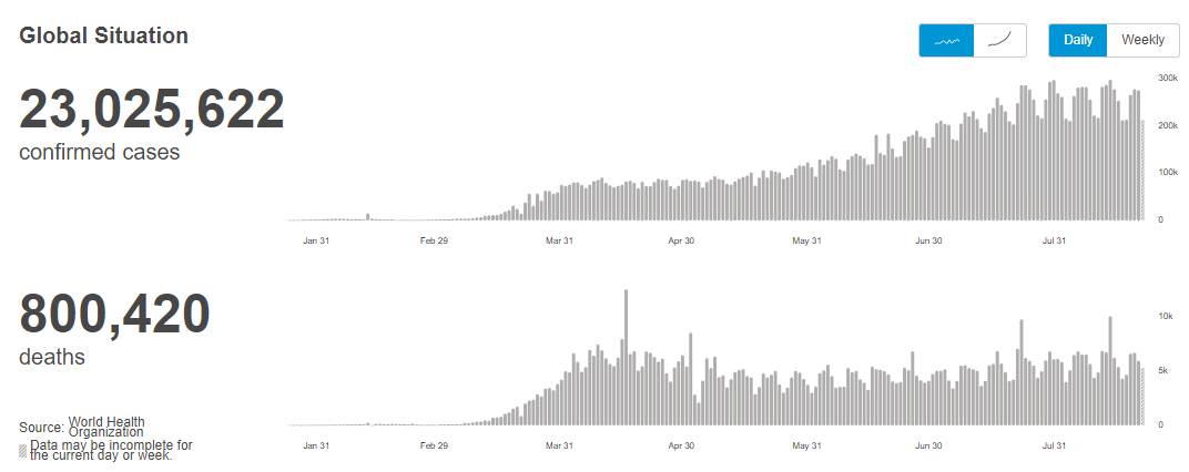 截至2020年8月23日,根据WHO统计,全球COVID-19确诊2,3025,622人,死亡800,420人。
