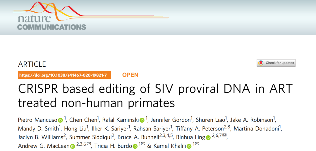 2020年11月27日,美国天普大学和内布拉斯加大学医学中心的研究人员在 Nature Communications 杂志上发表了题为:CRISPR based editing of SIV proviral DNA in ART treated non-human primates 的研究论文。