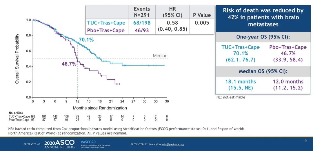 其中,108例在基线时进展为活动性转移,有66例未经治疗的活动性转移,有117例治疗的脑转移稳定且无进展迹象。经图卡替尼治疗和对照治疗分别有198例(48%)和93例(46%)。