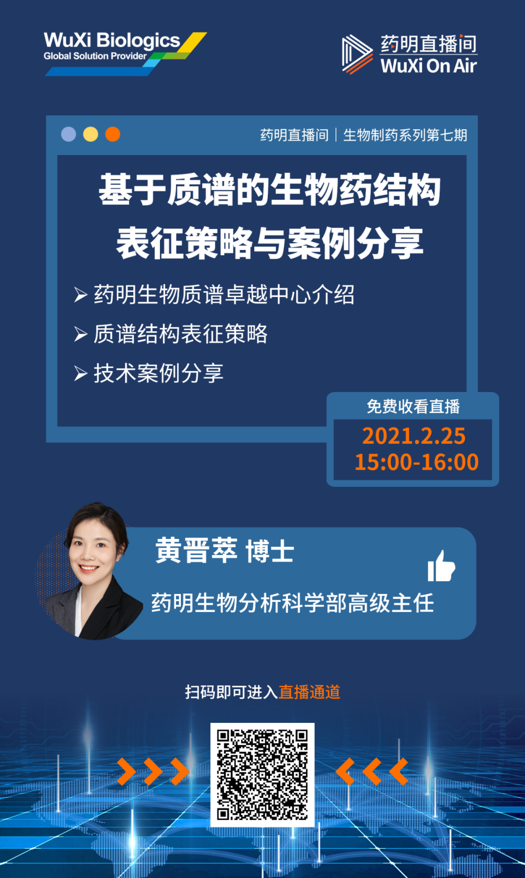 2月25日下午3点,药明生物分析科学部高级主任,黄晋萃博士 将做客药明直播间,与大家分享基于质谱进行生物药结构表征策略,并结合案例分享技术经验。欢迎大家一同参与讨论!