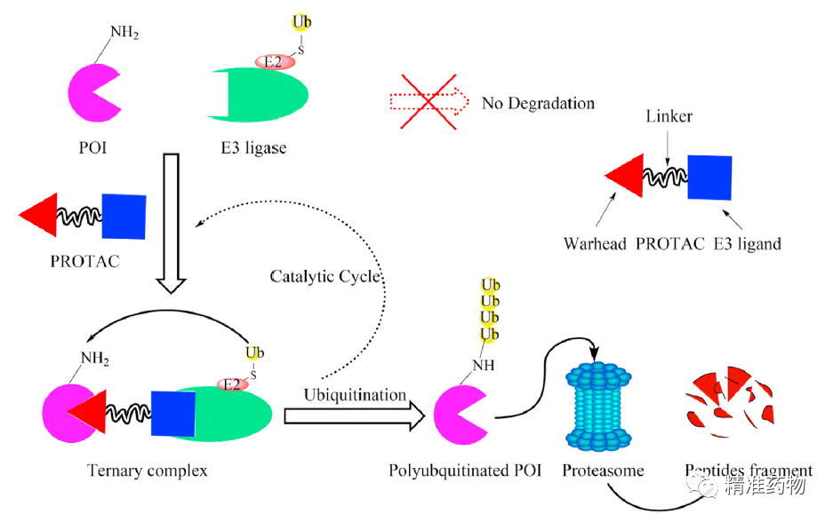 图1 PROTAC的原理图这种亚化学计量活性的MOA避免了高水平的给药和相应的不良反应。考虑到致病蛋白质必须在一定时间内重新合成,目标蛋白质的积累会被延迟。此外,降解是POI的一个迭代部署过程,与传统的小分子相比,POI不易增加靶基因的过度表达或突变。在某种程度上,PROTAC能够解决由传统抑制剂引起的获得性耐药性。由于PROTAC的降解机制与抑制剂有根本的不同,弹头只需要对受体有轻微的亲和力,因此理论上PROTAC有可能靶向多种难治性药物靶点。
