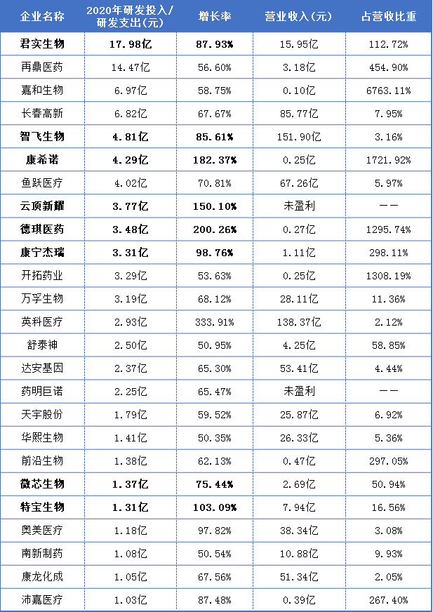 值得提及的是除去医疗公司,君实生物、康希诺、云顶新耀、德琪医药、康宁杰瑞、微芯生物、特宝生物7家企业研发投入/支出或者研发费用增长率超70%。几家公司均为生物医药企业,德琪医药、康希诺、云顶新耀、特保生物研发费用成倍数增长。