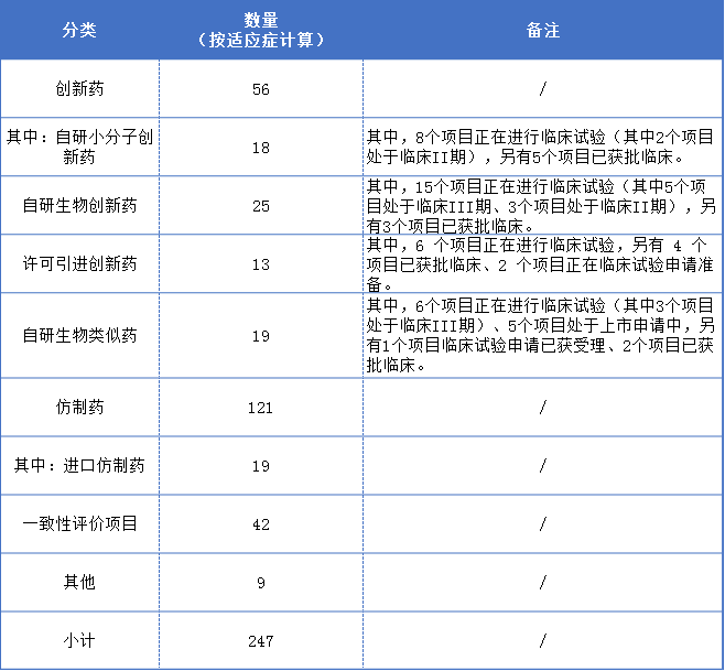 公告显示复星医药围绕肿瘤及免疫调节、四高(高血压、高血脂、高血糖、高尿酸症)及并发症、中枢神经系统等重点疾病领域搭建和形成小分子创新药、抗体药物、细胞治疗技术平台,并积极探索靶向蛋白降解、RNA、溶瘤病毒、基因治疗等前沿技术领域,提升创新能力。主要在研创新药、仿制药、生物类似药及仿制药一 致性评价等项目共 247 项。