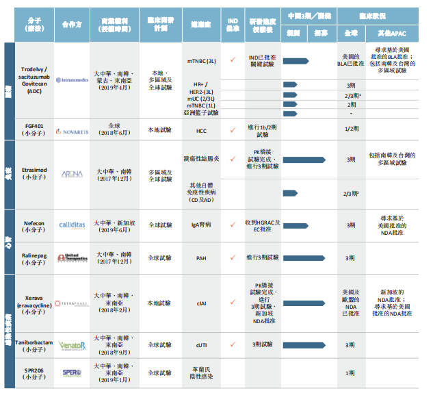 注 1:本表不包括 Gland Pharma 在研项目。注 2:本表不包括合营公司复星凯特的阿基仑赛注射液(代号 FKC876,即抗人 CD19 CAR-T 细胞注射液),该产品 已完成用于治疗成人复发难治性大 B 细胞淋巴瘤的中国境内桥接临床试验并被纳入药品上市注册优先审评程序。