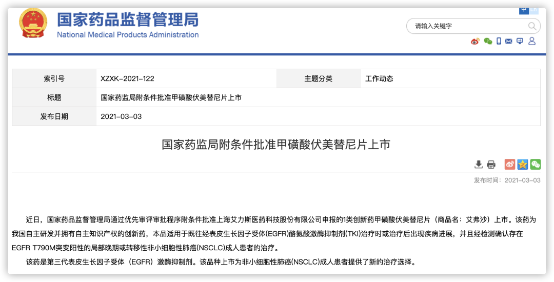 国家药监局附条件批准甲磺酸伏美替尼片上市