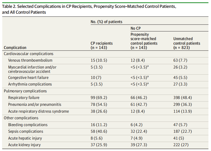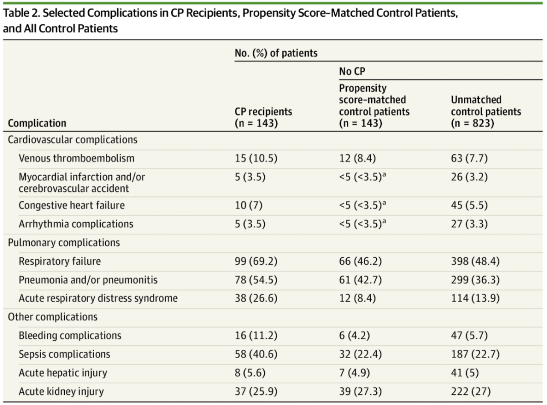 除了有效性之外,研究人员也对比了相应的副作用——其中几个常见的副作用包括:除血栓形成、肾损伤等。令人觉得欣喜的是:不论是血栓还是肾损伤,接受血浆疗法的患者发生率和未接受治疗的患者的发生率相似。
