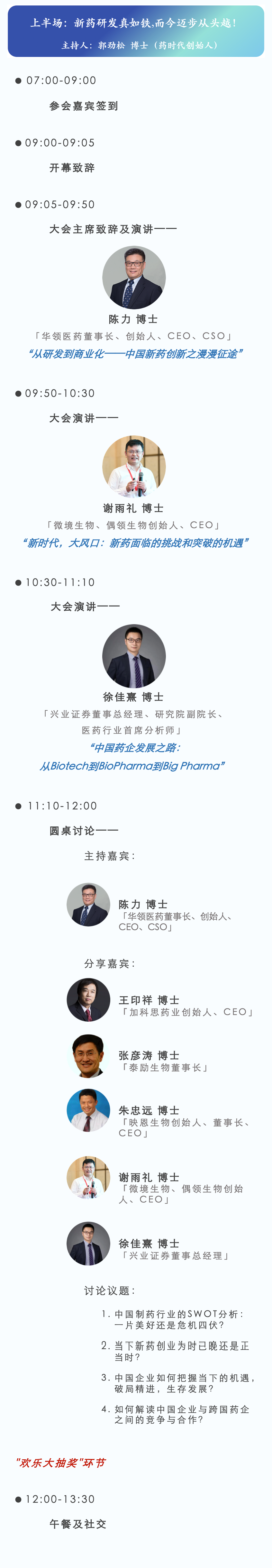 本次大会得到陈力博士和几十位新药领域的行业领袖和资深专家的大力支持(陈博士应邀担任本次大会的主席)。届时,群贤毕至,齐聚上海,从多个议题入手,分享他们的真知灼见和宝贵的第一手经验。两天的会期将覆盖从研发到商业化生产之端到端,贯穿从IND到NDA之全开发链,囊括自研和外部引进等方方面面,帮助您高效了解新技术、新战略、新打法,从而助力您的CMC创造新成就!