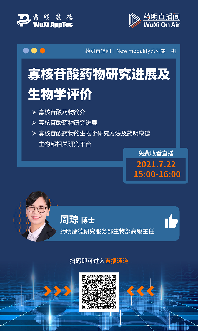 7月22日下午15:00,我们特别邀请了药明康德生物部高级主任周琼博士做客药明直播间,周博士将与大家分享寡核苷酸药物的研究进展,及团队在寡核苷酸药物生物学研究方面的经验和洞见。欢迎大家一同参与讨论!