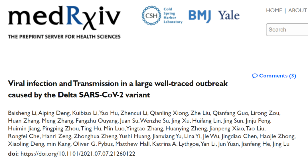 2021年7月23日,广东省疾控中心陆靖等人在预印本网站 medRxiv 发表了题为:Viral infection and Transmission in a large well-traced outbreak caused by the Delta SARS-CoV-2 variant 的论文。