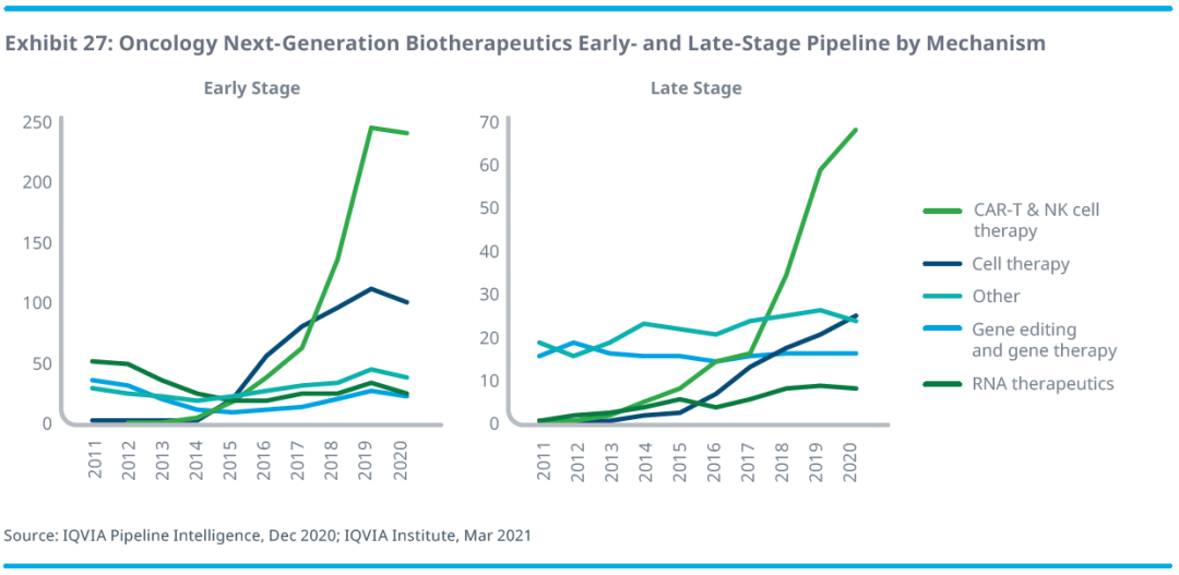 根据艾昆纬发布的报告显示:2020年,全球研发管线中的候选抗癌药数量接近3500个,相比2015年增长了75%,这表明肿瘤领域未被满足的临床需求仍然较大。2020年启动的肿瘤相关临床试验大约有1600个,创历史新高。处于研发早期管线的药物数量大约为1000种,相比2016年增长了43%,主要为包括基因编辑、CAR-T和RNA疗法在内的新一代生物疗法。