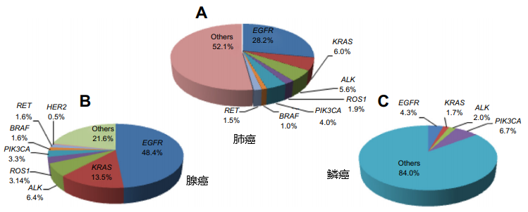 从肺癌基因突变谱(受种族和地区影响)来看,西方高加索人群和亚裔人群差异比较大。西方人群KRAS基因是第一大突变基因,EGFR突变率在15%左右,亚裔人群EGFR突变率较高,在整体肺癌人群中约有25-30%,在腺癌中约有50%甚至更高,另外还有ALK/ROS1/KRAS/BRAF/MET/RET等。