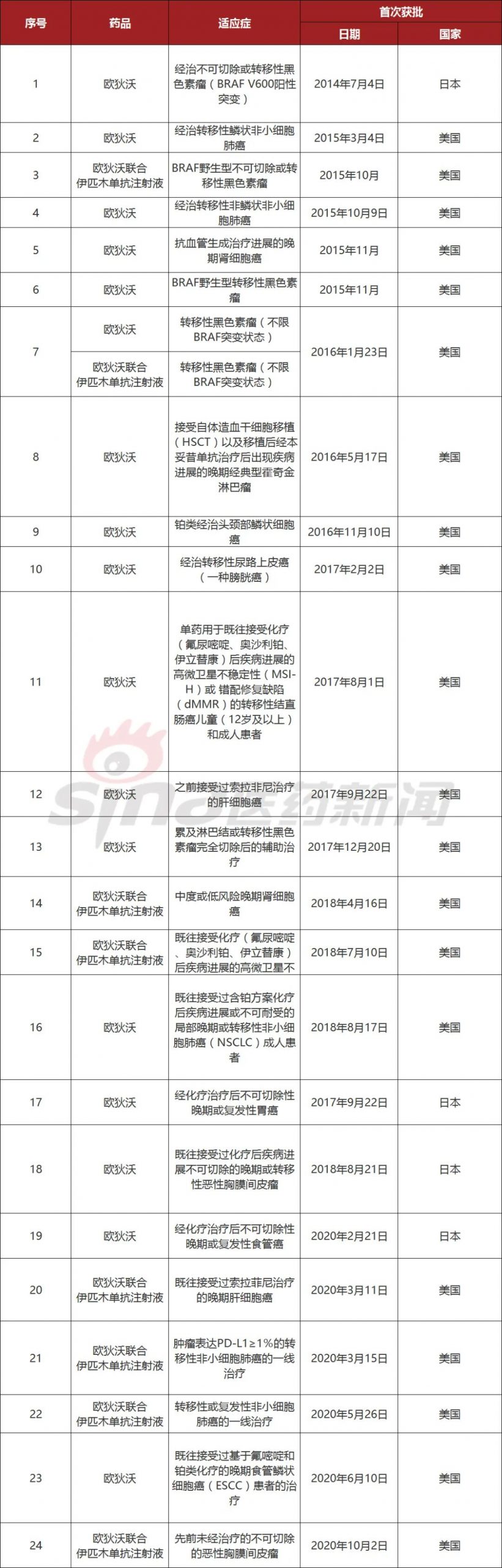 2018年6月15日,纳武利尤单抗在中国首次获批上市。到目前为止,该药已在中国获批四个适应症,除了最新获批的适应症之外,其余四个分别为: