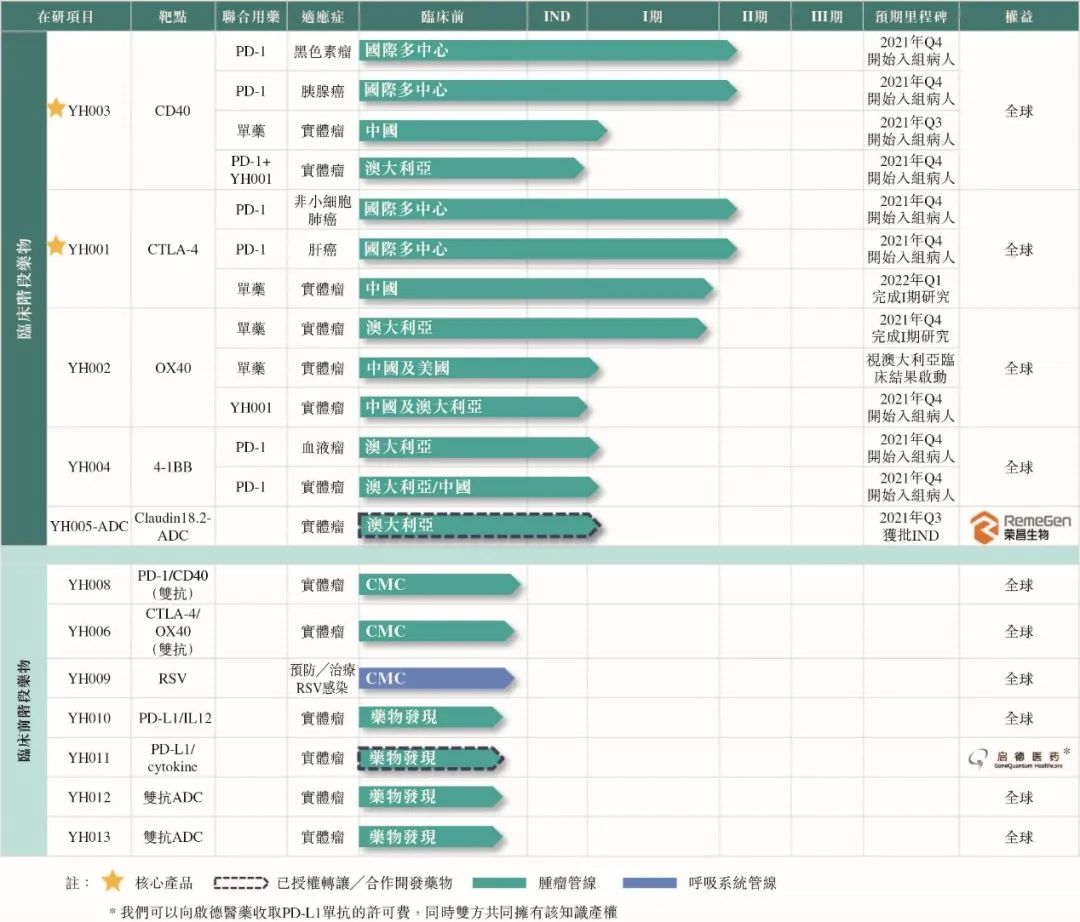 单抗赛道内:在研项目YH003(CD40)、YH001(CTLA-4)的研究进展在国内领先,YH002(OX40)也处于国内第一梯队。双抗赛道内:YH008(PD-1/CD40)、YH006(CTLA-4/OX40)、YH010(PD-L1/IL12)等都走在全球研发前沿,有望成为各自领域的基石。