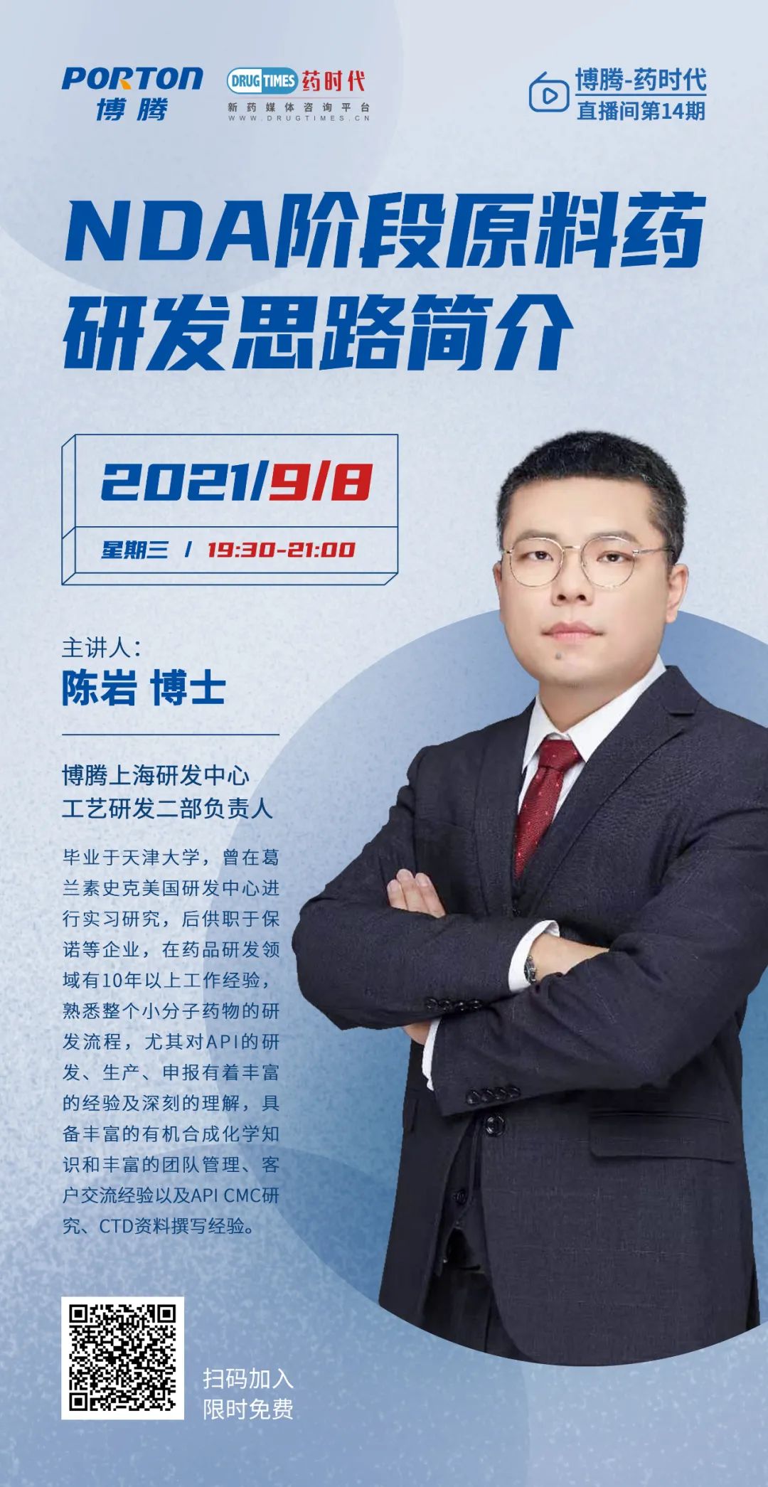 本次直播,我们有幸邀请到博腾上海研发中心工艺研发二部负责人陈岩博士以“NDA阶段原料药研发思路简介”为主题。