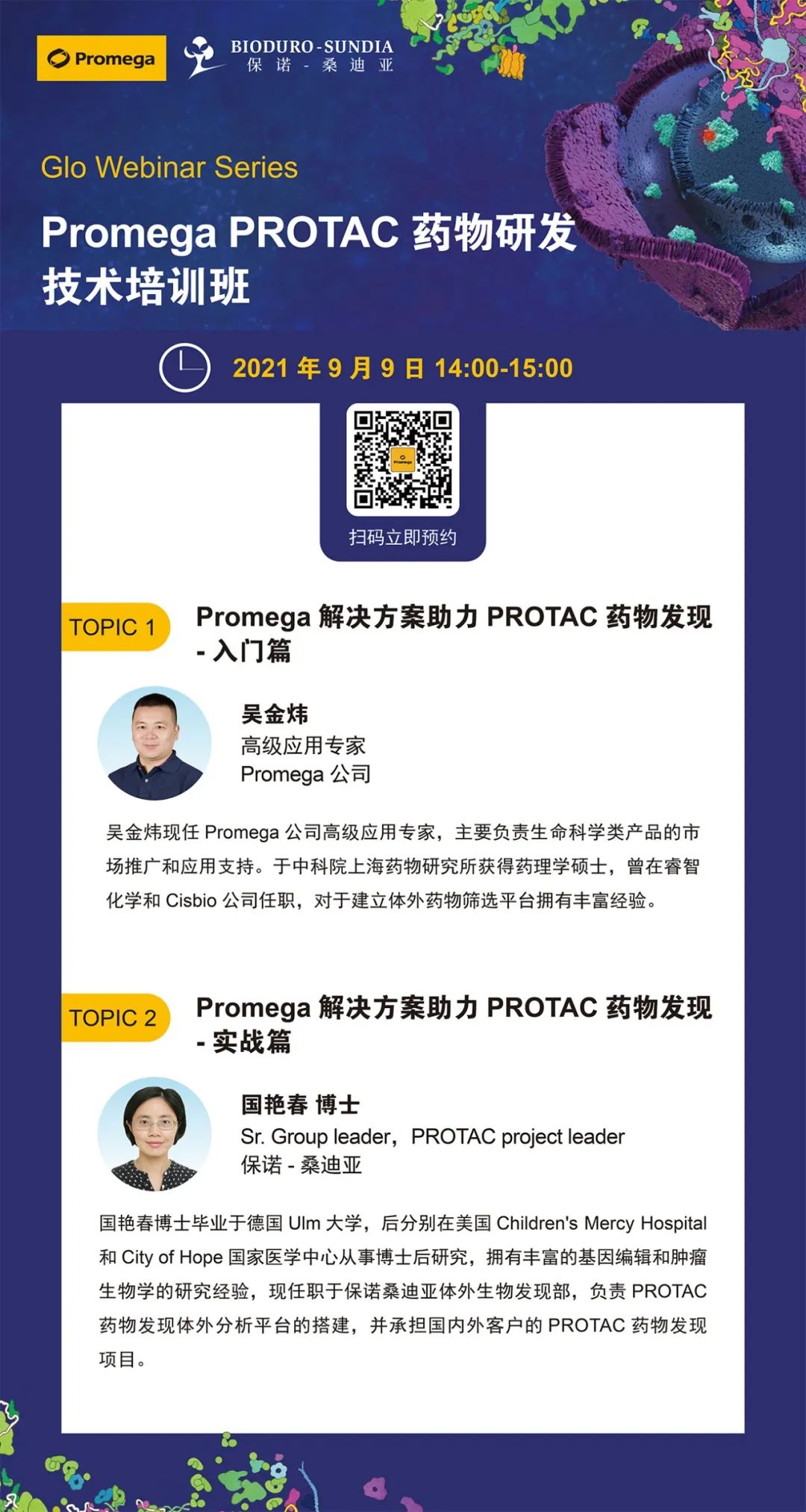 此次,Promega携手保诺-桑迪亚(BioDuro-Sundia)共同举办“PROTAC药物研发技术培训班”,旨在与大家共同探讨及交流PROTAC药物研发领域的前沿信息及技术。浏览下文立即报名,还有诸多PROTAC技术干货资料等着大家,期待您的加入!