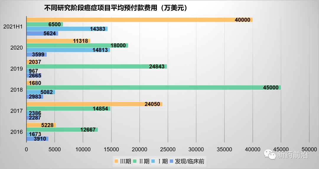 在大多数年份中,Ⅱ期阶段癌症项目的平均预付款更高。不过今年上半年Ⅲ期阶段的平均预付款猛增。值得关注的是,早期研发项目的平均预付款也走高。