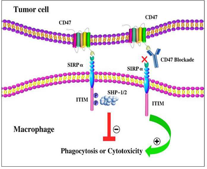 在肿瘤细胞表面过表达CD47可以帮助这些细胞逃避免疫细胞的监视和清除,使CD47成为新的抗肿瘤药物开发的一个极具吸引力的靶标。抗CD47可以阻断CD47-SIRPα抑制信号并促进巨噬细胞对肿瘤细胞的吞噬,并且可通过多种不同的机制发挥其抗肿瘤作用。