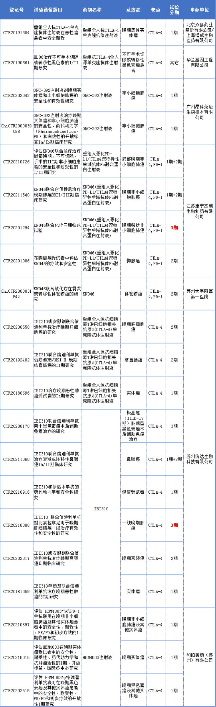 如此具有市场潜力前景的药物,无疑吸引一大批制药企业竞相加入赛道中,其中信达生物与康宁杰瑞进展最快,均已进入临床3期。此外,复星医药的重组抗 CTLA-4 全人单克隆抗体注射液( HLX13)用于无法切除或转移性黑色素瘤、晚期肾 细胞癌、微卫星高度不稳定性或错配修复缺陷的转移性结直肠癌治疗以及黑色素瘤辅助治疗于去年获得临床试验批准,进入 I 期试验。