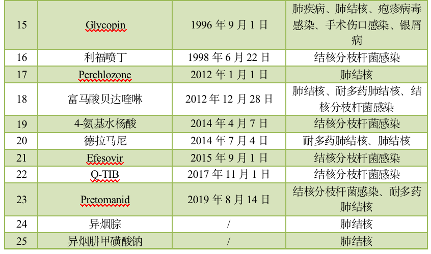 2019年08月14日,美国FDA批准由非盈利组织-全球结核病药物开发联盟(TB Alliance)开发的Pretomanid上市,与贝达喹啉(Bedaquiline)和利奈唑胺(Linezolid)联用,用于耐药肺结核(TB)患者的治疗。Pretomanid通过抑制分枝菌酸生物合成杀死复制的结核分枝杆菌,从而阻止细胞壁的产生。2020年07月31日,该药获得欧洲药品管理局EMA批准用于耐多药肺结核的治疗(商品名Dovprela)。