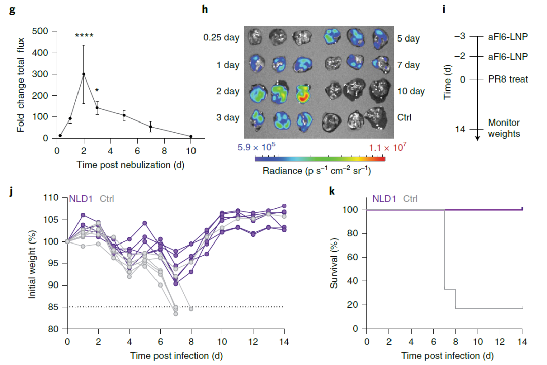 使用这三个设计规则,研究团队构建了一个名为雾化肺递送1号(Nebulized Lung Delivery 1,NLD1)的 LNP 进行进一步分析。他们配制了 NLD1 以携带抗HINI病毒的 mRNA,并以每只小鼠 100 µg 的剂量雾化给药。与现有的RNA递送系统相比,NLD1 在经过雾化后更稳定,具有良好的耐受性,对肺的转染效率更高,肺脏广泛表达递送的mRNA,使受病毒感染的六只小鼠全部存活了下来。