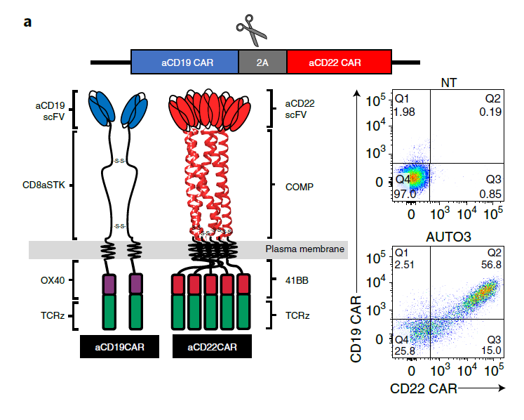 2021年10月12日,Nature Medicine期刊上公布了抗CD19和抗CD22 CAR的自体转导T细胞(AUTO3)在复发性或难治性B-ALL(n=15)的儿童和年轻成年患者中的I期试验,以评估AUTO3的疗效。
