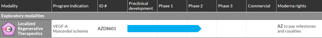 AZD8601项目,是一款编码血管内皮生长因子(VEGF-A)的局部mRNA疗法。由 Moderna 与阿斯利康合作开发,用于治疗接受了心脏旁路移植(CABG)手术的心力衰竭患者,目前正在进行2期临床试验。