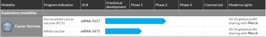 这两款癌症疫苗是与 Merke 联合开发,均已进入临床试验,分别是一款个性化癌症疫苗mRNA-4157,和一款靶向 KRAS 突变体的癌症疫苗 mRNA-5671。