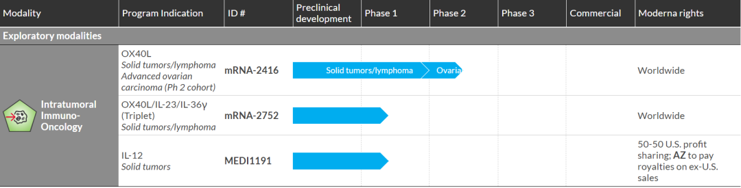 这三款疗法分别是编码 OX40L 的mRNA-2416,治疗实体瘤和淋巴瘤处于临床1期,治疗卵巢癌的处于临床2期。编码 OX40L+IL23+IL36γ 的mRNA-2752,治疗实体瘤和淋巴瘤,处于临床1期。以及编码 IL-12 的 MED1191,与阿斯利康联合开发,治疗实体瘤,处于临床1期。但有消息称,Moderna 决定放弃mRNA-2416。