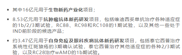 值得一提的是,荣昌生物国内少数拥有全面集成抗体药物偶联物(ADC)平台的生物制药公司之一,可用于ADC药物的发现、开发及生产等。荣昌生物基于该平台已实现了5项ADC候选药物的早期研发,其中维迪西妥单抗(靶向HER2)已进入商业化阶段;RC88(靶向间皮素)、RC108(靶向c-MET)和RC118(靶向Claudin 18.2)三款产品已进入临床研究阶段。