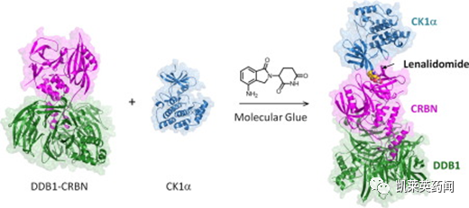 B. Ebert等[6]在2014年报道了第一个发挥蛋白质降解作用的分子胶降解剂来那度胺(lenalidomide),研究发现来那度胺结合于泛素E3连接酶CUL4-CRBN蛋白上,呈现多效性反应, 是由于靶蛋白的泛素化而引发的。作为E3连接酶的CUL4具有特异性,被CRBN的蛋白所调控。此外,来那度胺以及类似物沙利度胺(thalidomide) 和泊马度胺(pomalidomide)等还可以同该连接酶的其他蛋白结合, 例如介导对酪蛋白激酶1α (CK1α) 的降解反应, 揭示了来那度胺治疗与染色体5q缺失相关骨髓增生异常综合征[del (5q) MDS] 的作用机制[7]。