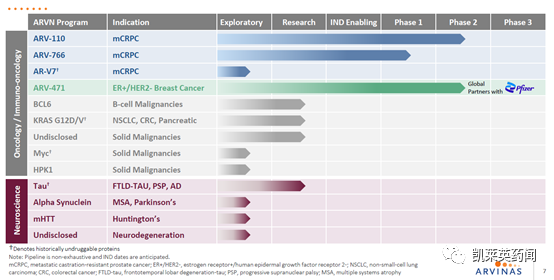 Arvinas开发的蛋白降解技术主要用于肿瘤和神经系统类疾病的治疗,目前进展最快的ARV-110和ARV-471都处在II期临床试验,分别用于前列腺癌和乳腺癌的治疗。2021年7月22日,辉瑞与Arvinas达成协议,共同开发并商业化ER降解剂ARV-471。根据协议,辉瑞将向 Arvinas支付6.5亿美元的预付款,以及3.5亿美元的股权投资,获得7%的股份。除了在全球范围内分享ARV-471的利润外,Arvinas还有资格获得高达4亿美元的批准里程碑和高达10亿美元的商业里程碑。除此以外,Arvinas还与默沙东、基因泰克、拜耳等制药巨头建立了合作关系。ARV-471作为Arvinas的一款潜在best-in-class靶向雌激素受体(ER)的蛋白降解剂,目前正在进行II期剂量扩展临床试验,用于治疗ER阳性/人表皮生长因子受体2(HER2)阴性(ER+/HER2-)的局部晚期或转移性乳腺癌患者。一项针对平均接受过5种既往治疗的ER阳性、HER2阴性乳腺癌患者的I期临床研究中期分析结果表明,ARV-471能够显著降低患者肿瘤组织中的ER表达水平,平均将ER水平降低62%,最多降低接近90%。14例可评估的患者中,1例患者达到确认的部分缓解,肿瘤病灶缩小51%。两例患者达到未确认的部分缓解,还有1例患者疾病稳定并且病灶缩小50%以上。