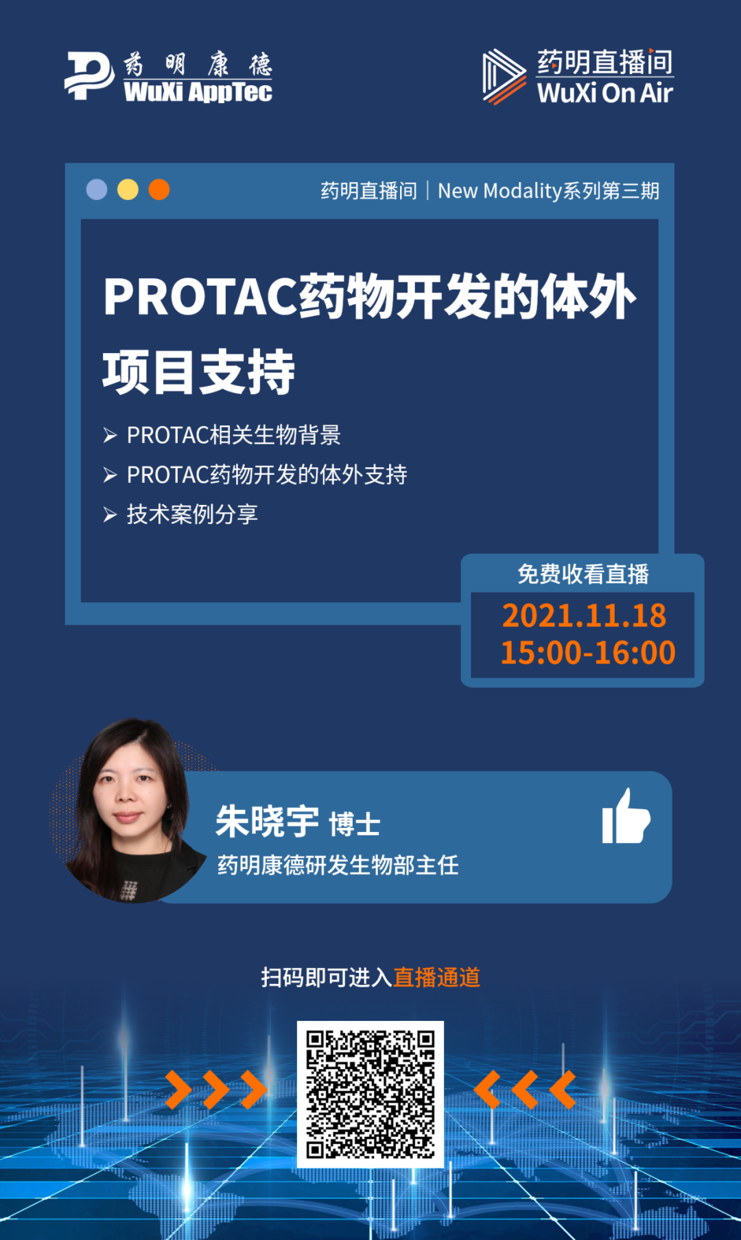 11月18日下午3点,我们特别邀请了药明康德研发生物部主任朱晓宇博士做客药明直播间,通过真实案例与大家分享PROTAC药物开发体外支持的相关经验。欢迎大家一同参与讨论!