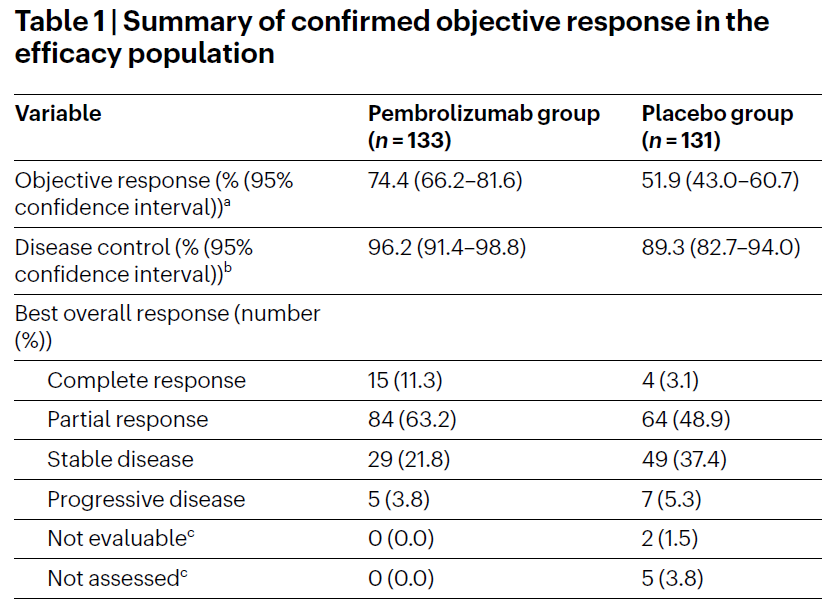 这篇 Nature 论文报告了前 264 名患者的中期分析结果,这些患者以1:1的比例随机分配接受派姆单抗+曲妥珠单抗+化疗或安慰剂+曲妥珠单抗+化疗。