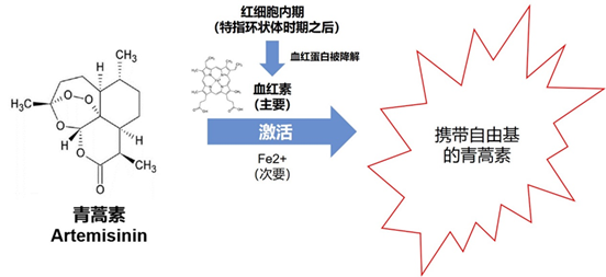 青蒿素先进入被感染的红细胞内,而后进入疟原虫的体内。由于疟原虫在成熟后会摄取红细胞内的血红蛋白作为营养和能量来源,血红蛋白的重要组成部分——血红素将会被释放出来,而血红素可以激活青蒿素,通过与过氧桥相关的开环反应使青蒿素带上致命的氧自由基。这时,青蒿素就像是一头被激怒的野兽一般,在疟原虫体内大开杀戒。
