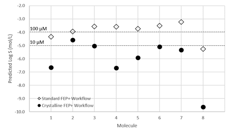 这里展示的例子是晶泰科技和美国 AbbVie 公司合作研究的一个早期溶解度预测的工作【4】,文章中针对 AbbVie 早期设计出的 8 个相似分子(图10)进行了溶解度预测。传统的溶解度预测,无论是 QSAR 方法,还是基于无定型态构建热力学循环计算溶解自由能的方法,由于都无法将晶体堆积作用对溶解度的影响考虑到模型中,因此预测出来的溶解度数据很难区分开具有相似骨架的同系列分子,如图 11 中的白色空心方点所示;但基于晶体结构信息的溶解度预测数据在相似分子间更具有区分度,如图 11 中黑色圆点所示。且和已有的热力学溶解度数据对比,预测溶解度和实验溶解度的误差更小(图12),因此可以用作先导化合物筛选的信息。最终, Abbvie 根据我们的溶解度预测值和其他 ADMET 值一起进行综合考虑,选择了 8 个分子中的一个进行后续开发。