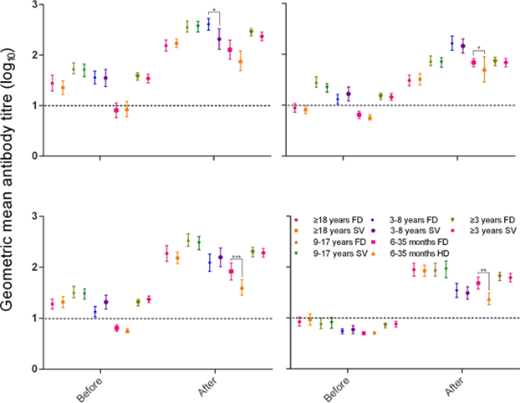 ② 部分参与者存在与年龄相关的流感病毒基线(接种疫苗前)反应性, 似乎所有 ≥ 3 岁的参与者都感染了H1N1 和 BY 亚型流感病毒 ,这可能反应了这两种亚型是过去一年中国流感流行的情况。