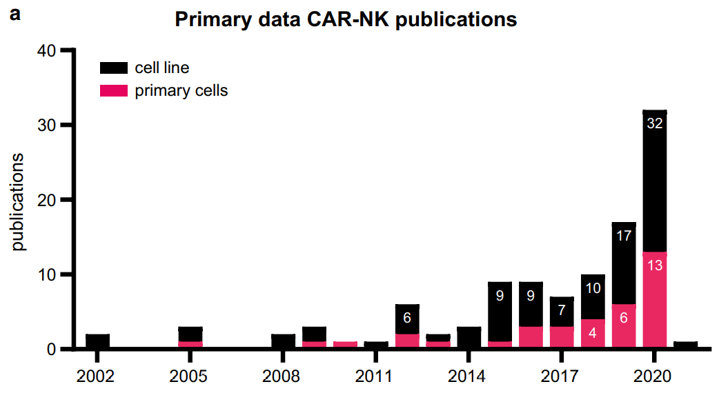 NK细胞是第一个被鉴定的先天性淋巴细胞(ILC)亚型,能对病毒感染和/或转化的细胞产生多种效应器功能,主要是细胞杀伤和产生促炎细胞因子。CAR-NK疗法的研究目前处于起步阶段,临床前和临床研究的数量逐年增加,这体现在每年都在增加的关于CAR-NK的研究论文。